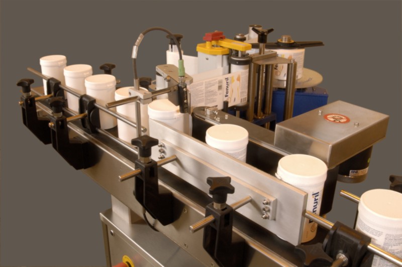 Le système d'étiquetage 1 est conçu pour l'application automatique d'étiquettes autocollantes partielles ou enveloppantes sur des récipients cylindriques.
